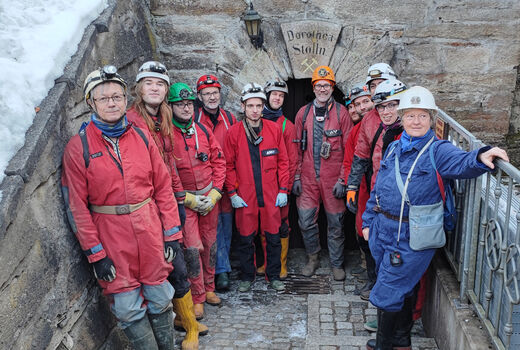 Auch in der Fledermausschutzzeit kann man in der Tiefe unterwegs sein: Hier vor der Einfahrt zur "Langen Tour" im Dorothea Stolln von Annaberg-Buchholz (Erzgebirge), eine Tour im Rahmen der diesjährigen Hauptversammlung mit Übernachtung in Geyer.